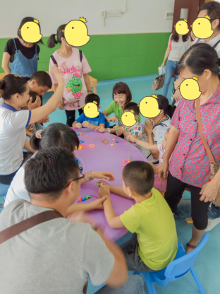 活動(dòng)根據(jù)不同能力的孩子設(shè)置了不同的游戲,針對(duì)行動(dòng)不便的孩子,設(shè)置了“穿珠套環(huán)”、“帽子戲法”、“UNO”三個(gè)靜態(tài)的游戲,是坐在椅子上動(dòng)手就可以完成的游戲。針對(duì)肢體條件好且比較好動(dòng)的孩子,則安排了“親子揪尾巴”、“袋鼠跳”和“親子飛行棋”三個(gè)游戲,讓孩子進(jìn)行激烈的運(yùn)動(dòng),消耗旺盛的精力。