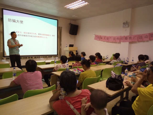 活動(dòng)由兩部分組成,第一部分是向現(xiàn)場(chǎng)的活動(dòng)參加者講述防騙大使的相關(guān)內(nèi)容,包括什么是防騙大使,防騙大使的權(quán)利和義務(wù),如何成為防騙大使;第二部分是向參加者講解電信詐騙的相關(guān)知識(shí),包括如何防范電信詐騙、常見電信詐騙類型、遭遇電信詐騙的處理等。共有26名長者參加了本次活動(dòng)。