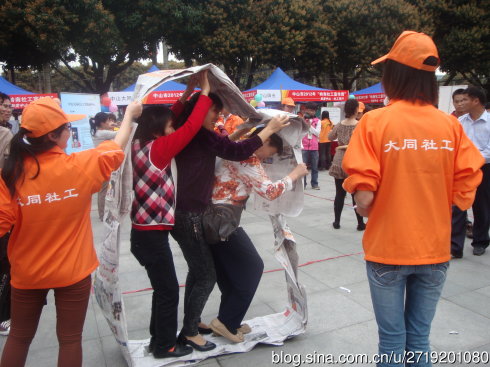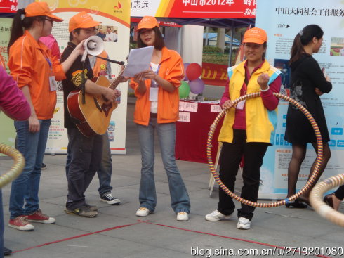 后來,整個社工宣傳活動引來了很多年輕人,他們看到我們大同攤位上的三個呼啦圈,就紛紛表示想玩。于是,結(jié)束“齊心協(xié)力”游戲的社工便又組織起“呼啦圈達(dá)人”游戲來,根據(jù)現(xiàn)場的實際情況,游戲的帶領(lǐng)社工靈活變動游戲規(guī)則,讓游戲參與者在游戲當(dāng)中充分展示自己的達(dá)人風(fēng)采。在組織游戲的過程中,我們大同的一名社工發(fā)現(xiàn)旁邊的志遠(yuǎn)社工機構(gòu)攤位上有人在彈吉他,于是靈機一動,我們這位大同社工便主動邀請吉他彈唱者與我們合作,一同參與到“呼啦圈達(dá)人”游戲中,為正在轉(zhuǎn)呼啦圈的人獻上好聽的音樂,志遠(yuǎn)社工也很積極地與我們合作。